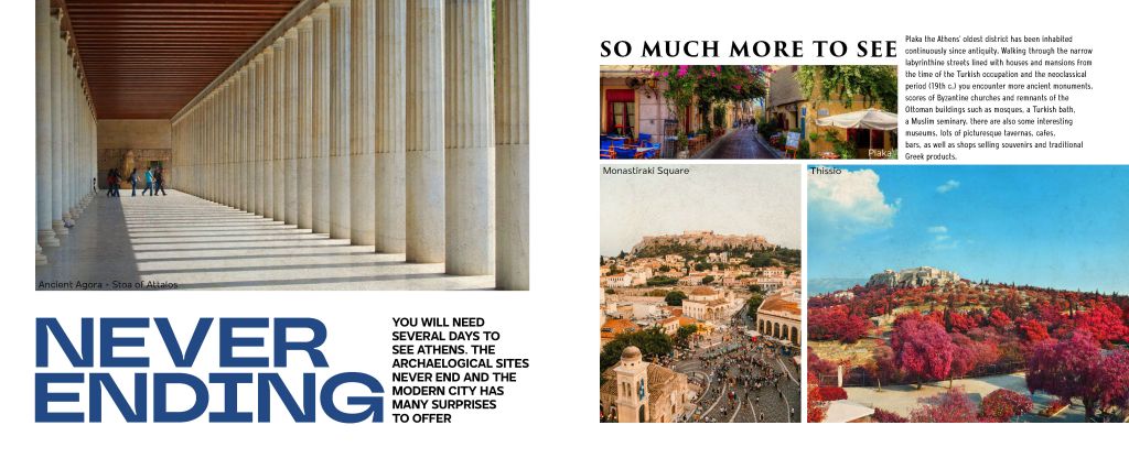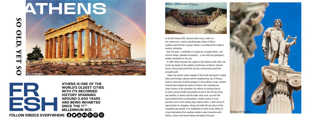 This is a travel brochure done for my Process and Production class. We had to make a special cover or do something with our cover to make it more appealing, my back cover folds over with a black and white image of Athena, the goddess of Athens. I based my design off the Greek flag and the color blue. Almost every image includes the color, so I wanted to keep that cohesive throughout the entire brochure. This is made to attract so I used very appealing imagery and beauty shots. I used a slab serif font that is representative of the ancient Greek writing style, just more modernized. The brochure promotes history in a modern way.